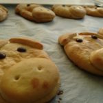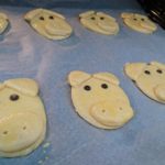 Den Teig auf einer bemehlten Arbeitsfläche ca. 0,5cm dick ausrollen. Mit einem runden Ausstecher oder einem Trink – Glas (Durchmesser 6cm), 20-25 Kreise für die Schweinchenköpfe ausstechen, auf die vorbereiteten Backbleche setzen und mit dem Eier-Milch gemisch bestreichen.