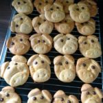Die restlichen 20 Teigkreise mit einem Messer halbieren und als Ohren daraufsetzen. Für die Augen, entweder Rosinen oder backfeste Schokodrops verwenden. Die Glücksschweinchen nochmal mit der Eiermilch bestreichen und im vorgeheizten Backofen (Ober-/Unterhitze 175 °C) ca. 20-25 Minuten goldgelb backen. Je nach dicke der Teiglinge länger oder kürzer der Backzeit, bitte immer ein Auge darauf halten. Nach dem Backvorgang die Schweinchen auf dem Kuchenrost auskühlen lassen.
